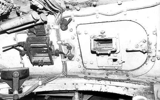 "Справа от гнезда спаренного пулемета - механизм запирания смотровой амбразуры во лбу башни"