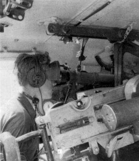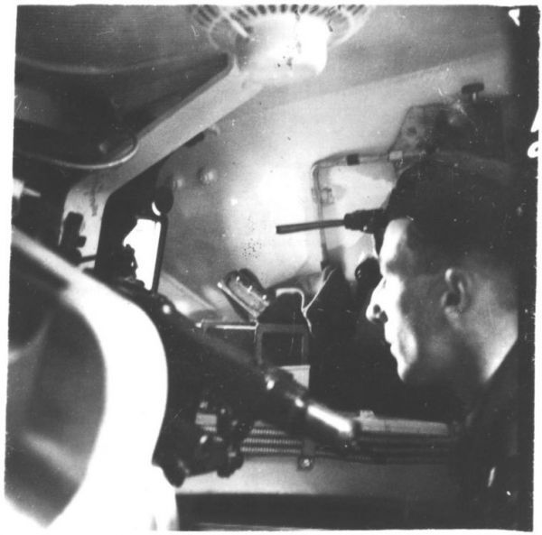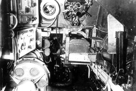 "Укомплектованное место стрелка-радиста. Слева на трансмиссии располагалось радиооборудование. Обзор на поздних версиях осуществлялся лишь через прицел курсового пулемета"