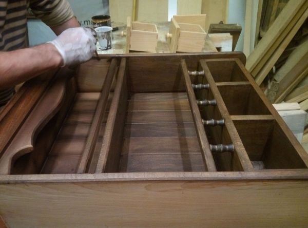 Мажу морилкой. Часть морилки нанесено пистолетом, часть натиром.