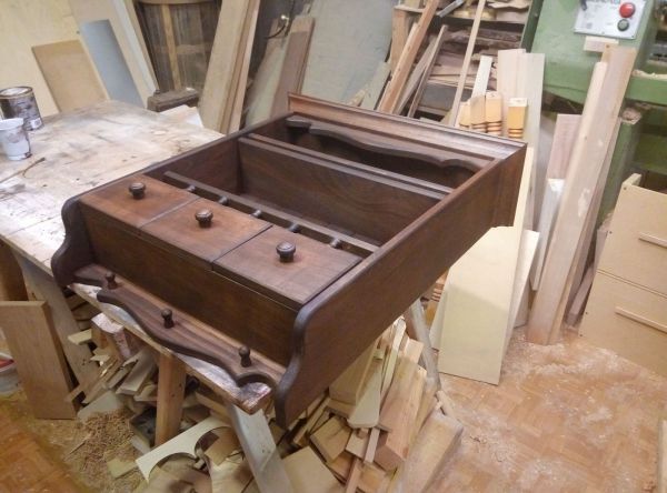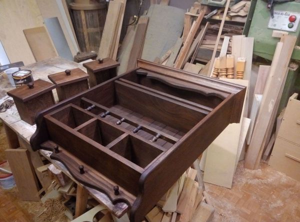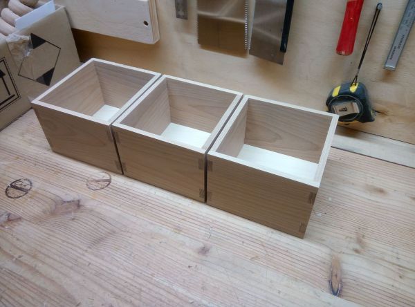 Необходимо изготовить 3 выдвижных ящика. Было решено собирать все на шип. В первом варианте полки ящики были собраны на ласточкин хвост, собранных руками.