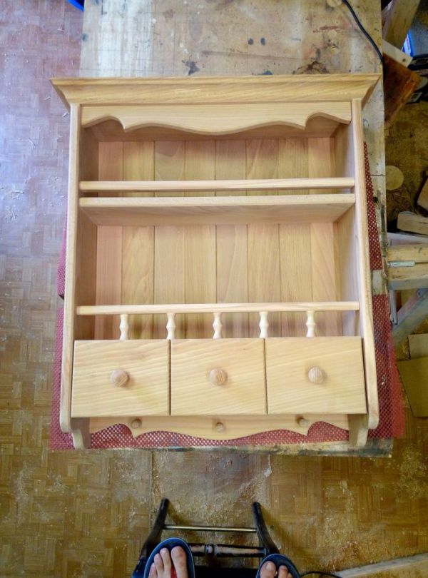 Полка готова к отделке. Фасады сделаны из единой доски, чтобы рисунок продолжался на соседних фасадах.