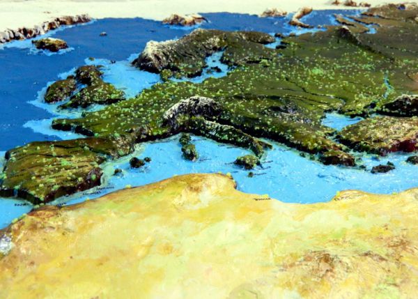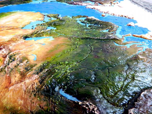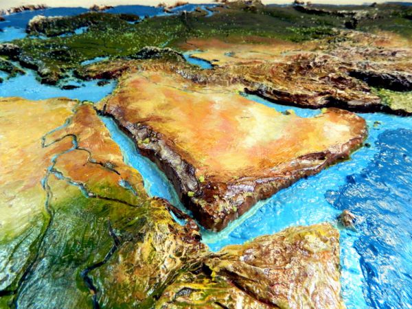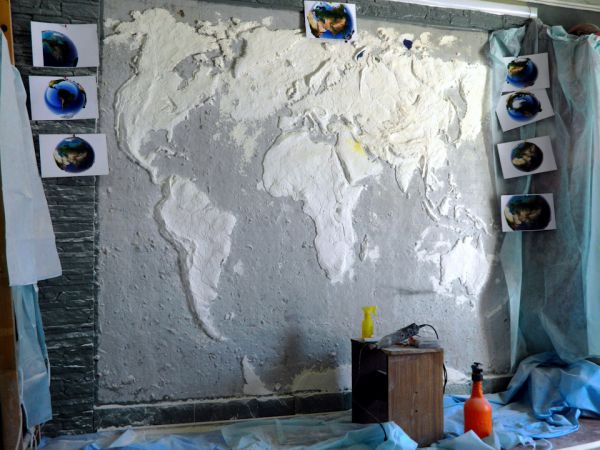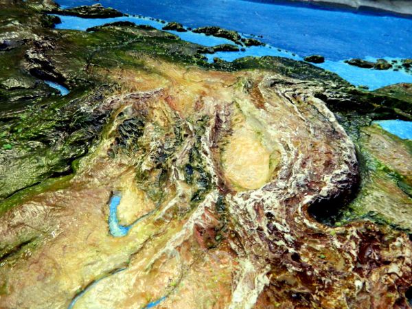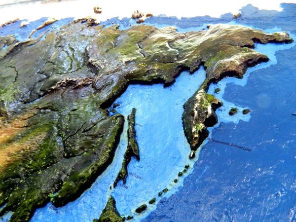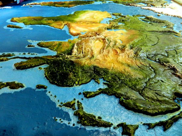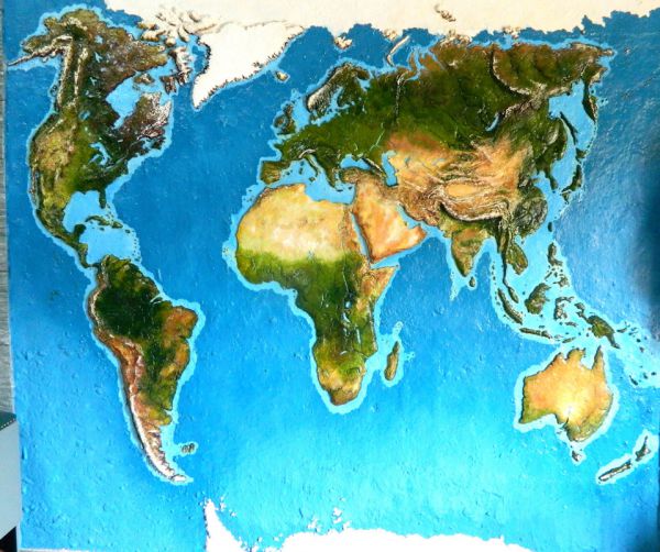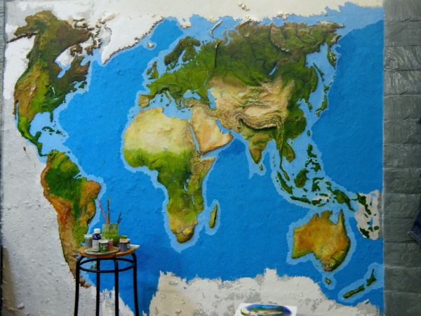 Разными насадками на гравер (дремель) пробурил реки, выровнял береговые линии материков, стали рельефнее горы и равнины. Пыли было много.