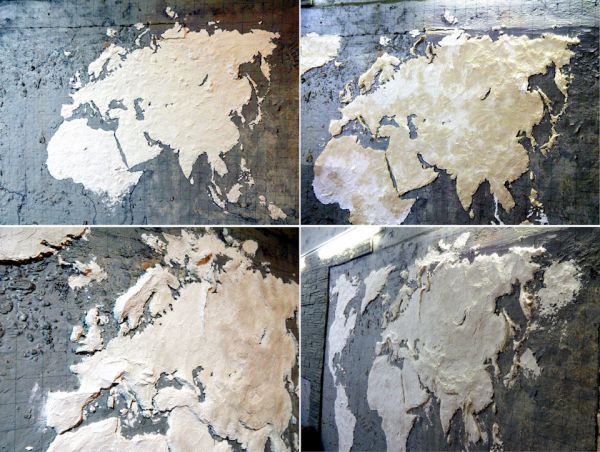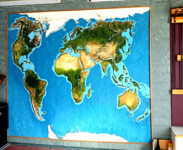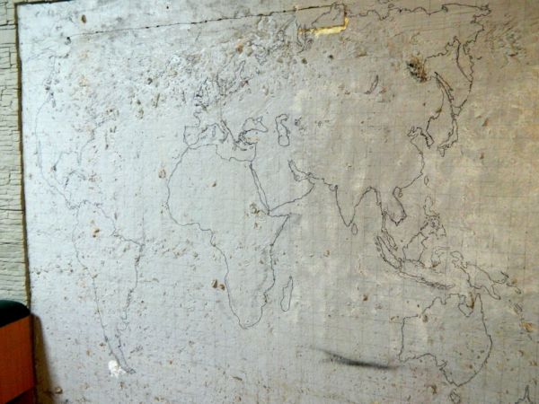 Гараж. Совсем не симпатичная серая стена. Почему бы не попробовать создать карту Земли (без претензии на суперточность, просто как декор)? Расчертил стену на квадраты, ну, чтобы перенести контуры материков с карты на стену… потом сообразил, что проще воспользоваться домашним проектором. С проектором получилось быстрее и точнее, чем по старинке — по клеточкам. Пришлось немного карту сдвинуть влево, так как справа внизу выпирала Новая Зеландия, из-за неё пришлось разделить Алеутщину и отдалить Чукотку от Аляски.