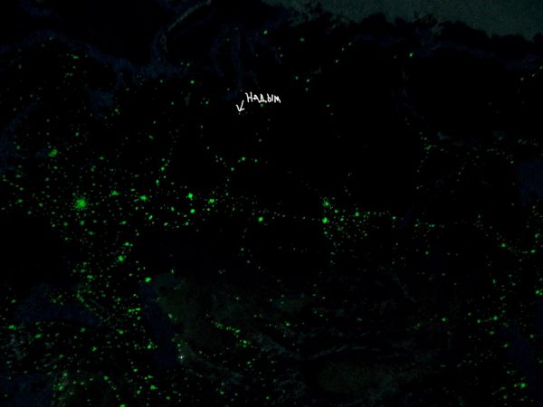 Кристаллы люминофора( светятся в темноте) станут городами. Кристаллы смешиваются с акриловым бесцветным лаком и с помощью зубочисток, тонких кистей приклеиваются в места постоянной дислокации. Что жёлтые кристаллы, что зелёные — светят одинаково.