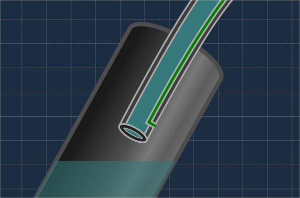 Бензин протекает через узкое кольцо. В районе сужения скорость потока увеличивается, а давление в жидкости падает — это следствие эффекта Вентури. Само устройство называется кольцом Вентури, и в нем есть отверстия, сообщающиеся с воздушной камерой (зеленый). Поток жидкости создает в воздушной камере разрежение. Эффект Вентури также используется в пульверизаторах, аэрографах и карбюраторах.