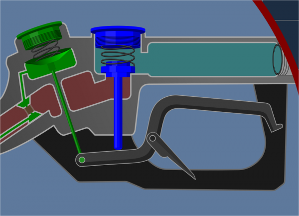 Нажимая на рычаг, мы толкаем вверх шток клапана (синий), открывая бензину путь к баку. Обратите внимание, что ось рычага прикреплена к штоку предохранителя (зеленый).