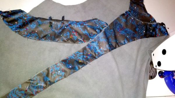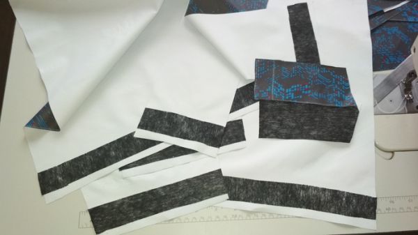 Теперь проклеиваю клеевой тканью низ рукавов, полочки и спинки. Так они лучше держат форму внизу.