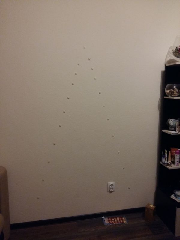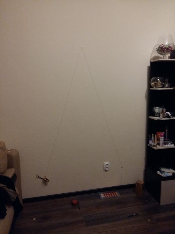 С помощью самоклеющих площадок выставил верхнюю точку. Из неё опустил отвес вертикально вниз, и там рулеткой по равному расстоянию от центра нижние угловые точки. Далее из одной угловой точки, через верхнюю в другую нижнюю тоже пустил отвес. Потом наметил остальные точки крепления от верха елочным шагом по 10 см, по 15 см и по 20 см.
