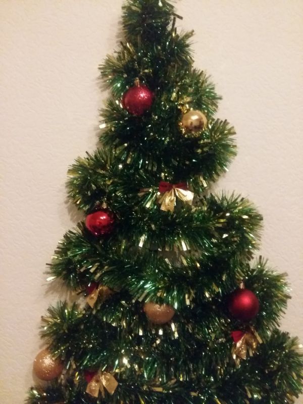 Ну и нарядил ёлочку игрушками, обрезал кончики стяжек и включил гирлянду!)