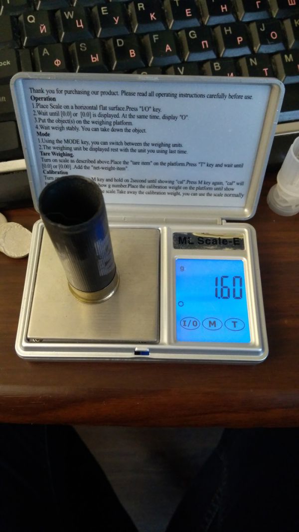 Далее засыпаем в готовую, капсюлированую гильзу порох, 1.6 грамма. Пороха пробовал разные, остановился на импортном Драго, самый дорогой, но и самый качественный.