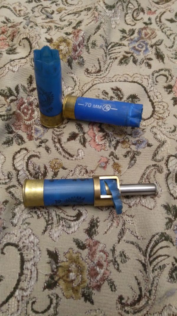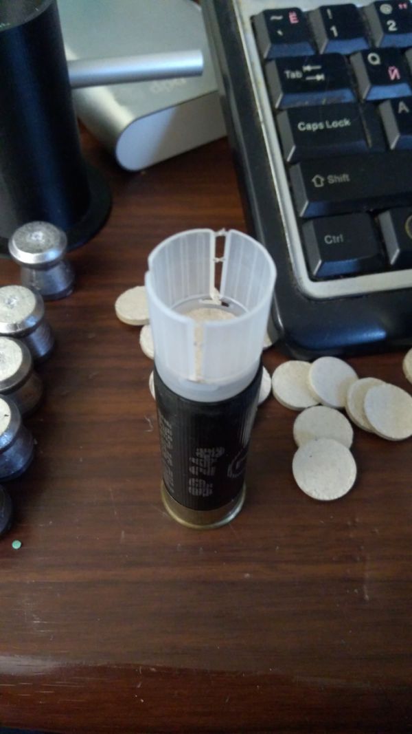Сверху на порох ставим пыж контейнер, под пулю я использую итальянский чедит, так как у него самый жёсткий амортизатор. Для дроби идут и главпатрон и азот.