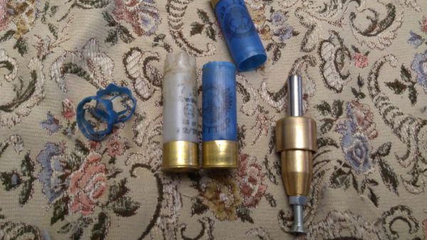 В пыж контейнер кладу толстую (2.5 мм) картонную прокладку 20 калибра. Она облегчает отстыковку контейнера от пули в момент вылета ее из ствола и защищает хвостовик пули от деформации.