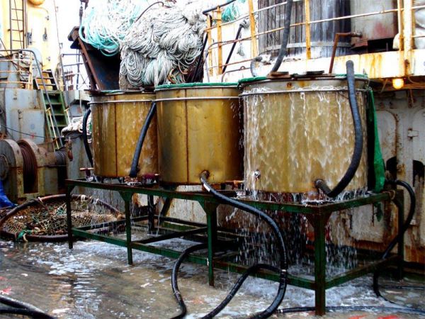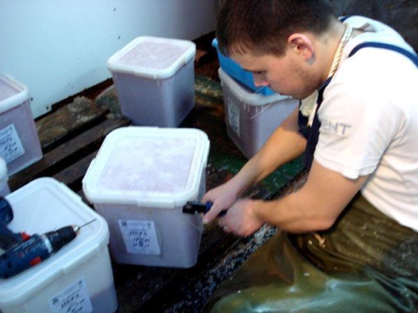 Сортировка ястыков с икрой по видам. Смешивать икру от разных рыб — недопустимое преступление. Здесь же и моют ястыки забортной водой.
