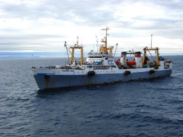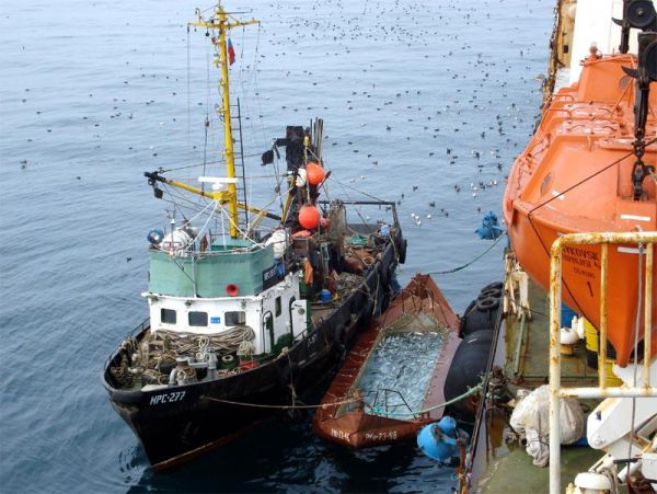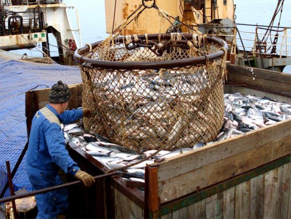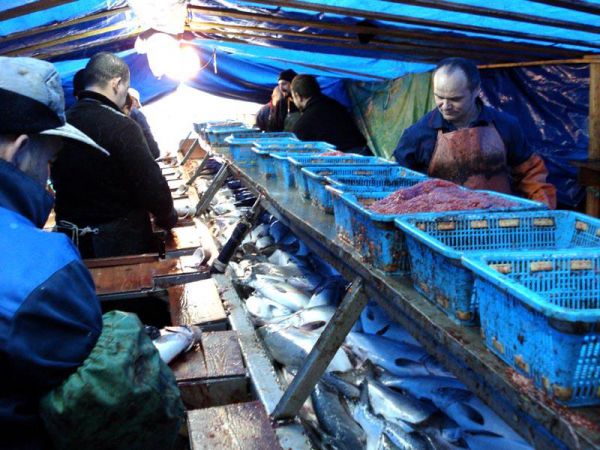 Со ставных неводов рыбаки-добытчики поставляют улов на приемо-перерабатывающее судно.