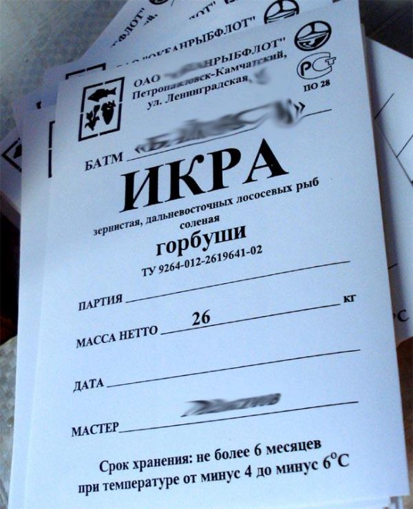 На каждой емкости тары этикетка с указанием производителя, вида икры, даты изготовления и т.п.