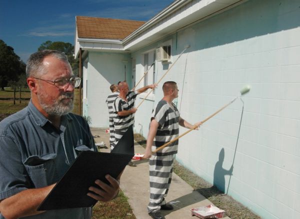 Заключенные тюрьмы на северо-востоке штата Флорида, США, красят стены одного из зданий, принадлежащих университету Флориды. Полосатая форма — это классический вариант одежды для заключенных. Столь необычное одеяние объясняется двумя причинами. Во-первых, такая одежда облегчает поимку сбежавшего — она хорошо заметна для тех, кто ловит беглеца, а местные жители, увидев его, сразу понимают, что это именно бежавший заключенный, а не вышедший прогуляться турист. Во-вторых, необходимость носить необычную и одинаковую для всех заключенных одежду оказывает определенное психологическое влияние, подавляя волю и отделяя заключенных от свободных людей. Впрочем, до первой половины XIX века заключенных никто спецодеждой не обеспечивал. Кое-где так было и в начале ХХ века.