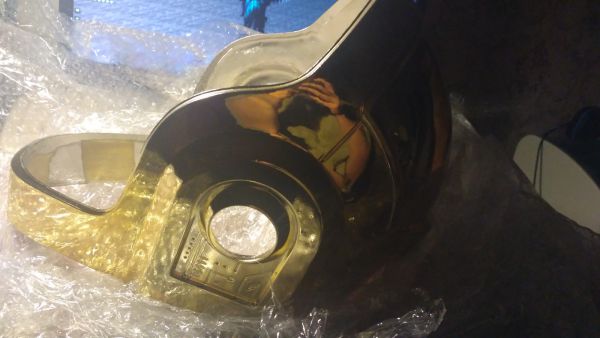 После литья модель все равно надо было обработать, т.к. не особо удачно был сделан силиконовый молд. А именно в некоторых местах, где есть углубления и узоры силикон плохо затек. Но все равно это не заняло много времени. Некоторые места все же пришлось прошпаклевать. После чего модель была отполирована наждачкой с мелким абразивом, от 1000 до 2000 и отправлена на химическую металлизацию. Либо на вакуумную металлизацию… Я даже не знаю точно. Нашел контору, которая согласилась мне это сделать, и отправил им шлем по почте.
