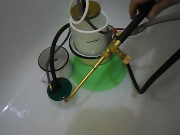 Конденсатор соединен с выпаривателем вакуумным шлангом(штуцер без трубки).Второй штуцер конденсатора(с муфтой и трубкой) соединяется с водоструйным насосом.У меня есть здесь пост про водоструйный насос из горелки сварочной.Холодная вода вытекающая из насоса охлаждает корпус конденсатора.