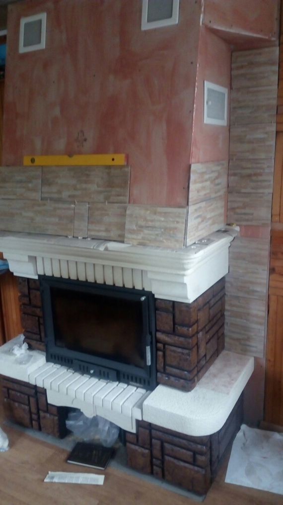 Выставили по отметкам топку и начали выставлять на герметик облицовку. Геометрические размеры блоков облицовки неточные, использовали деревянные клинышки. Облицовка ещё и очень хрупкая.