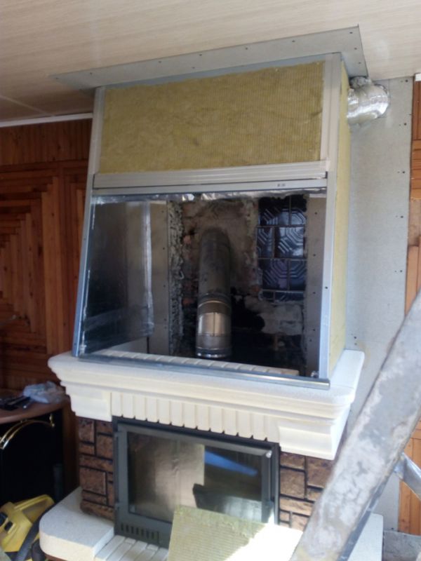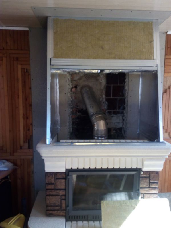 Собрали каркас и подключили дымоход камина к дымоходу в стене, неплотности заделали клеем для печей.