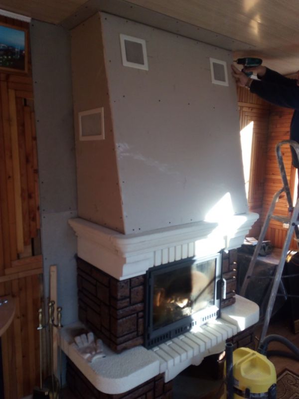 Стены гостиной облицованы ольховой вагонкой по деревянному каркасу. После разметки паркеткой отпилили облицовку с двух сторон из расчета - шире облицовки камина на 200 мм. Поставили гипрочный каркас, заполнили минватой и пеной, обшили огнестойкой плитой Flamma.