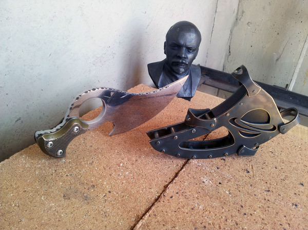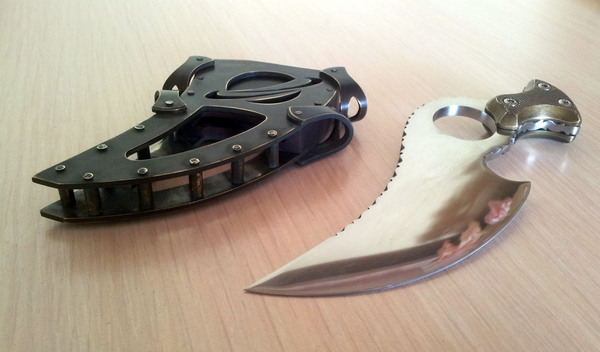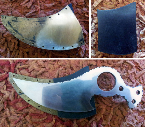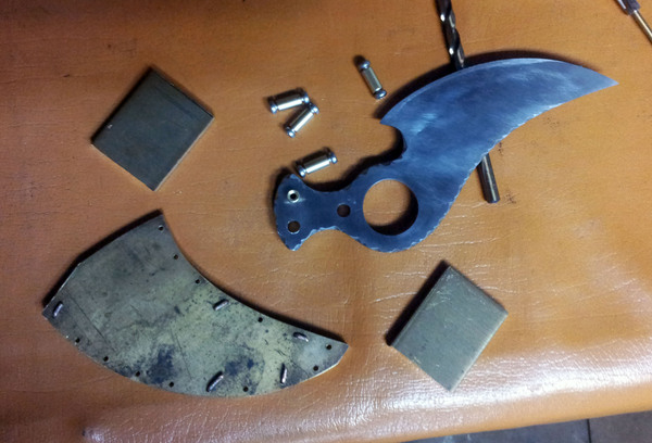 В левом нижнем углу на верхнем фото лежат заготовки под ножны, тоже латунь но толщиной 2мм. Их две, хоть и видна только одна, просто одинаковые они. В них я уже насверлил отверстий под клепки.