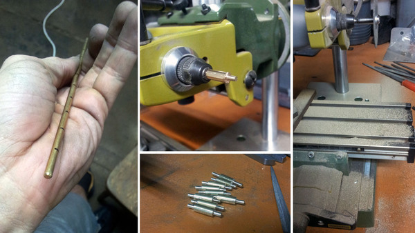 Далее идут средства соединения всего этого воедино - клепки. Делаются они из прутка 4мм, путем распила (и отката) и обточки с концов под отверстия на пластинах: