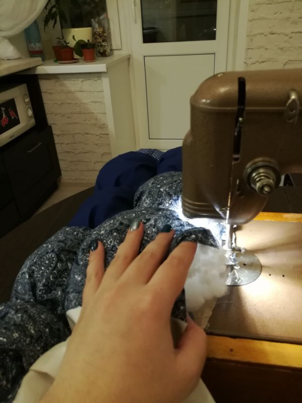 Сшивать полосы, уже набитые холлофайбером, - дело неблагодарное, и, как оказалось, двух рук тут не хватает (если у вас ручная машинка). Двумя руками нужно придерживать холлофайбер с двух сторон от машинки, а третьей крутить ручку. Пришлось привлечь мужа на помощь.