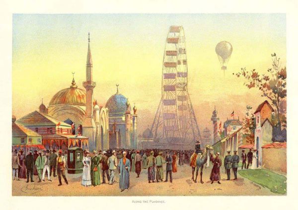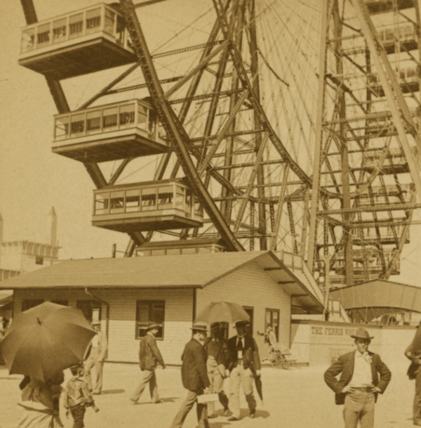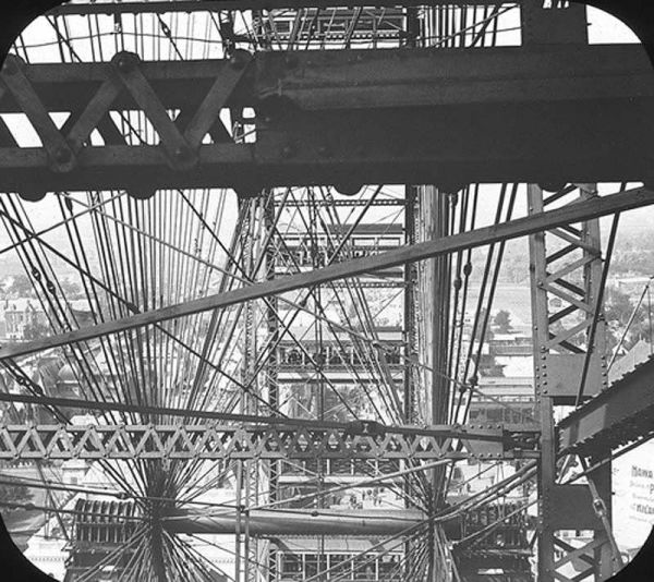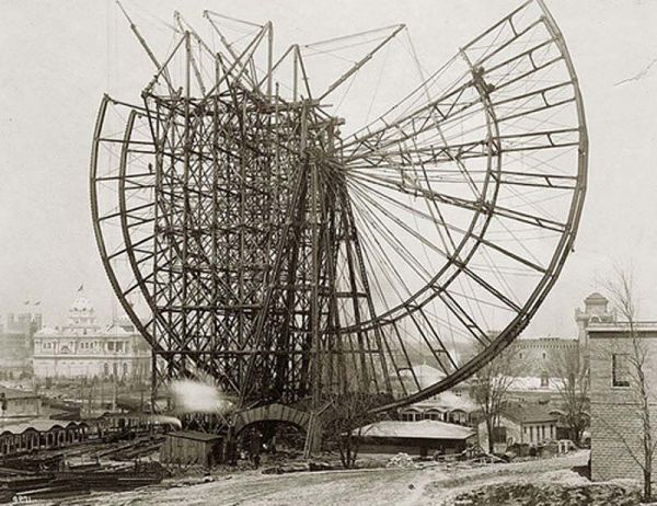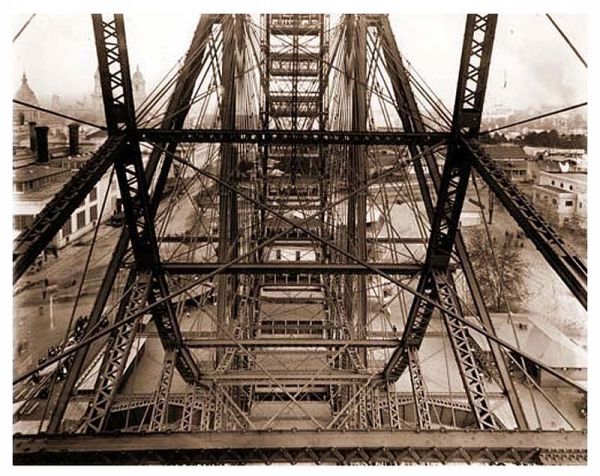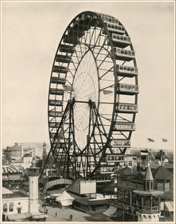 Известный инженер Джордж Вашингтон Гейл Феррис решил, что перещеголять зарвавшихся европейцев можно при помощи огромного вращающегося стального колеса с прикрепленными к нему кабинками, в которых посетители будут с замиранием сердца любоваться на Чикаго с высоты птичьего полета. Уж в чем нельзя отказать американцам, так это в деловой хватке и умению держать слово. Задумано — сделано. Огромная стальная машина была построена к открытию выставки, диаметр колеса был 75 метров (для сравнения — диаметр крупнейшего в Москве колеса 73 метра). Весила махина около двух тысяч тонн, была выше самого высокого в то время американского небоскреба, а вращалась при помощи двух паровых машин мощностью по тысяче лошадиных сил каждая. К колесу были прикреплены 36 кабинок размером с добрый автобус — в каждой могли разместится по 60 зрителей. Главная ось колеса весила 70 тонн и стала на то время самой большой кованой железной деталью в истории человечества. Успех был потрясающим — колесо ни простаивало ни минуты, а после выставки в Чикаго поучаствовало еще и в выставке в Сент-Луисе. Удачную идею подхватили по всему миру, сначала в Британии, затем и в Европе. Уже через 10 лет в мире насчитывалось больше ста подобных колес обозрения.