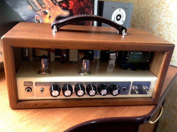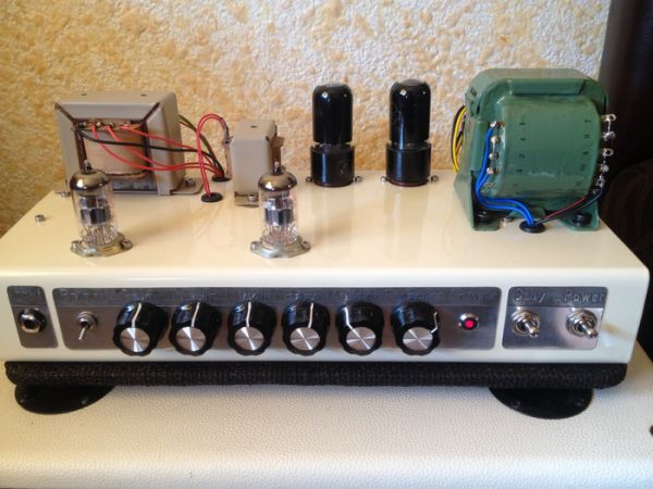 Из ключевых изменений - темброблок сделал трехполосный, добавил тумблер "Bright", ручку "Presence" и "Master Volume", а так же линейный вход для преампа, то есть полный набор функционала стандартного чистого канала. На борту имеем две лампы ECC83S, (предусилитель и фазоинвертор) и две 6П6С в оконечном каскаде. (можно смело воткнуть 6V6, но в целях экономии, и ввиду того, что у меня есть десятка три новых, не пользованных наших 6П6С, пользую именно их, и особой разницы в звуке не заметил, в сравнении с каноническими 6V6)