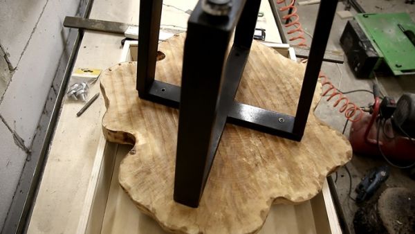 Собираем все вместе. Прикручиваем подстолье к столешнице. В идеале надо в дерево вкрутить футорки и прикрепить подстолье болтами. Но я использовал обычные саморезы.