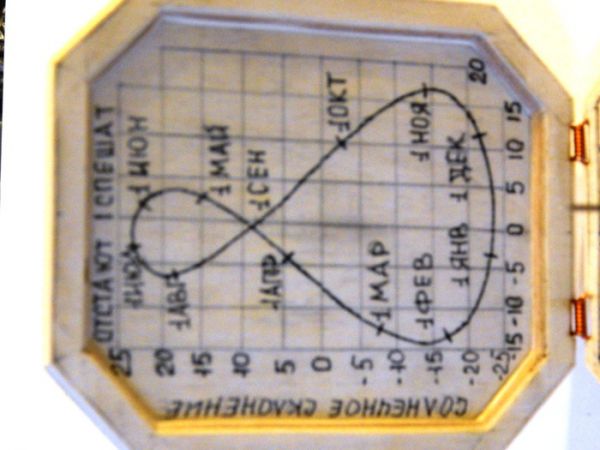 Иными словами эта кривая показывает на сколько спешат или отстают наши часы относительно среднего времени. Так например в октябре Солнце оказывается в зените на 16 минут раньше, а в феврале на 14 минут позже полудня по среднегодовому времени. Связано это явление с эллиптичностью орбиты и наклоном оси Земли. Не будем вдаваться в подробности, нам важно знать сколько минут в какой день нужно прибавить или отнять от показания наших солнечных часов чтобы относительно точно определить время. Для этого мы эту красивую загогулину расположим на внутренней поверхности крышки.