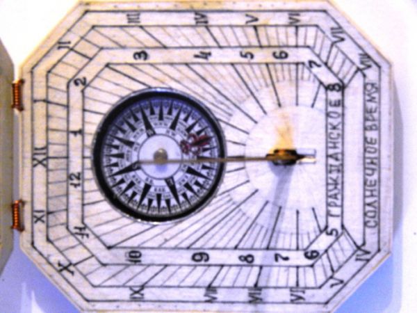 Из названия статьи уже становится понятно, что данный прибор является мобильным, то есть переносным, которому для определения времени необходима ориентация относительно земных координат, а именно: полуденная линия часов должна совпадать с направлением меридиана. Для этого в конструкции был установлен компас. Кстати, эти часы будут корректно показывать время только в той местности, координаты которой использовались в расчётах. Долгота места определяет угол наклона гномона (стрелки часов) и часовые деления кадрана (циферблата ), а широта имеет значение для поправки местного времени к часовому поясу (гражданскому времени).