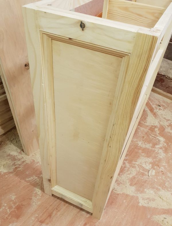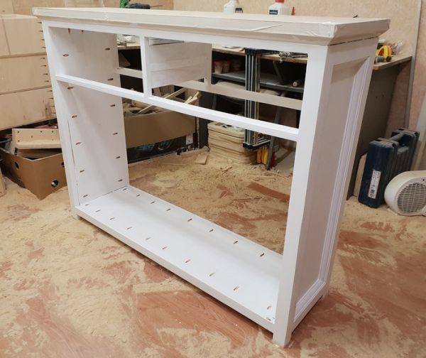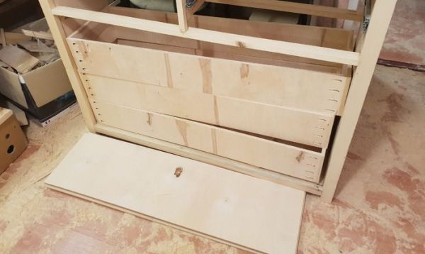 Крутим ручки, устанавливаем направляющие для ящиков, регулируем зазоры и закатываем шпоном столешницу