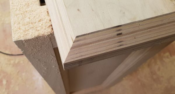 Фрезером снимаем нижнюю фаску у столешницы: