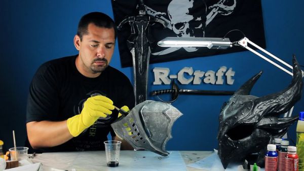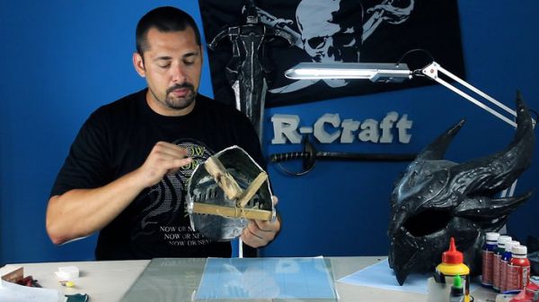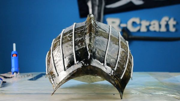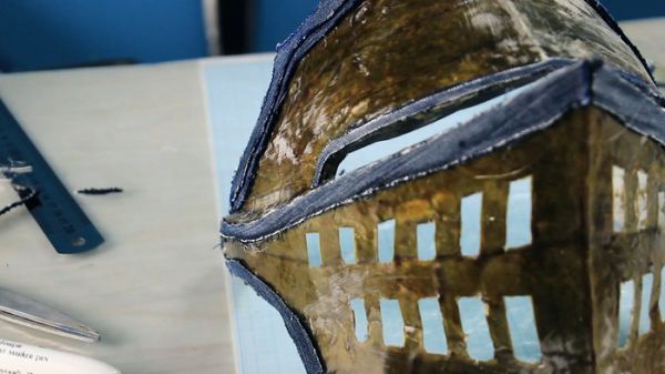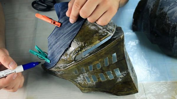 Ребра жесткости на забрале я приклеил из ткани, а точнее из своих старых джинсов, толщина материала была подходящей. И пропитал эпоксидной смолой.