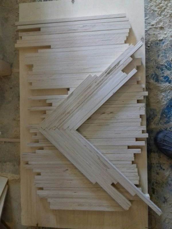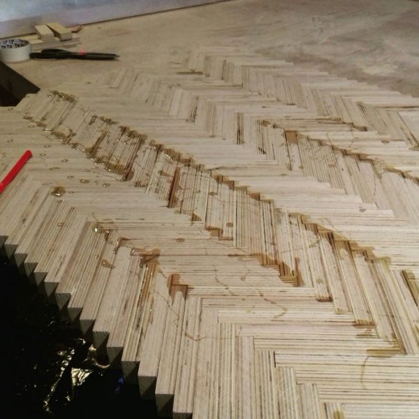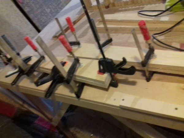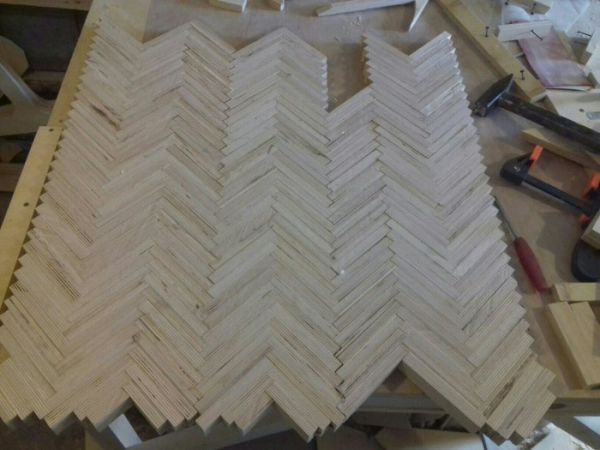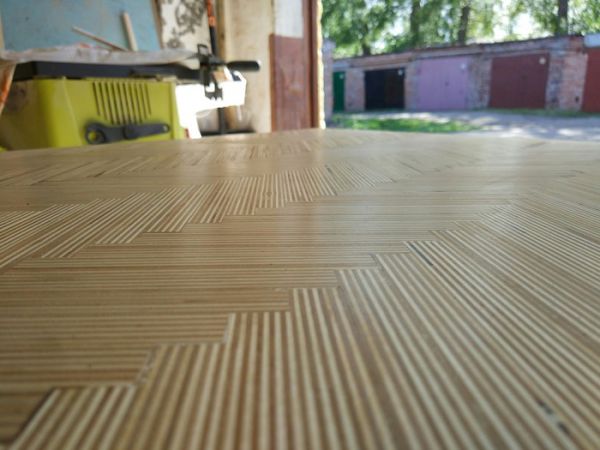 Дальше нужно было найти ровную поверхность и начинать склеивать брикетики, я выбрал узор ёлочка. Склеивал частями, потому что пока нет длинных струбцин.
