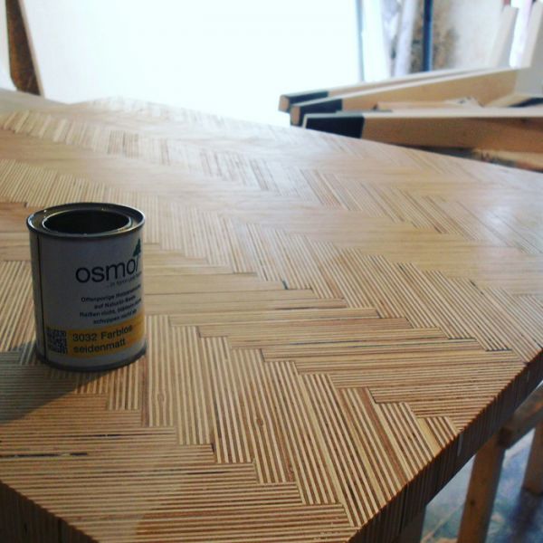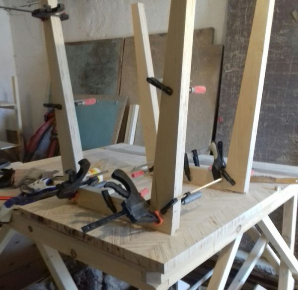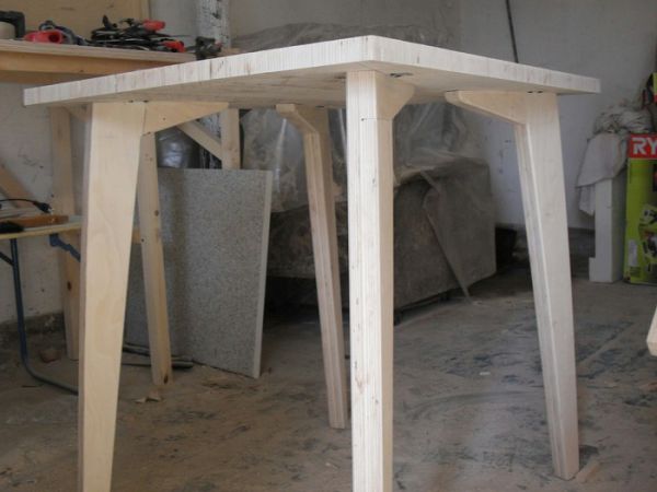 Со столешницей всё ясно. Беремся за ножки. Изначально они были одной формы, но после примерки и теста на устойчивость все было переделано. Ножки клеились из 2х листов фанеры.