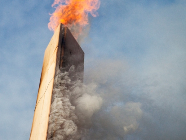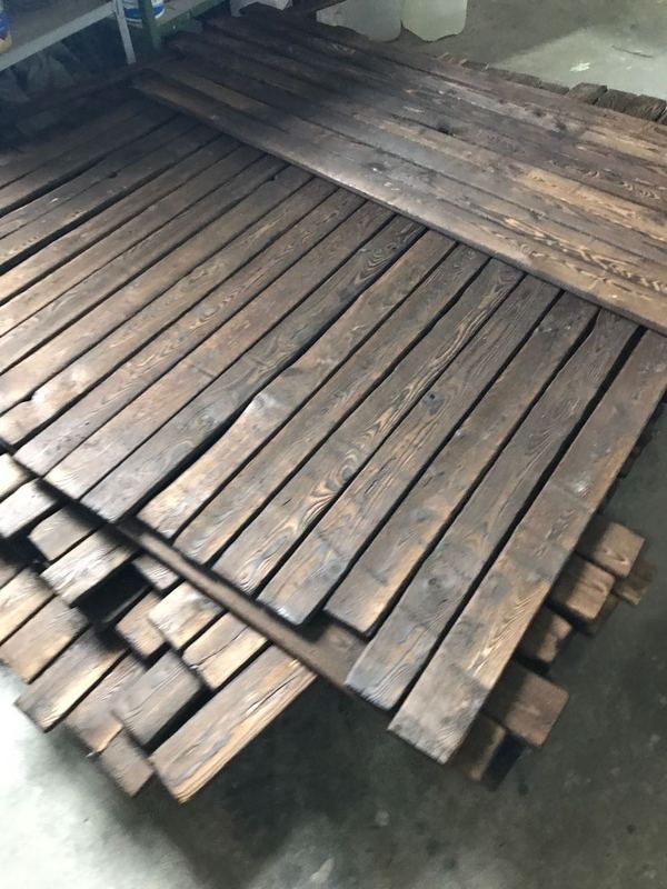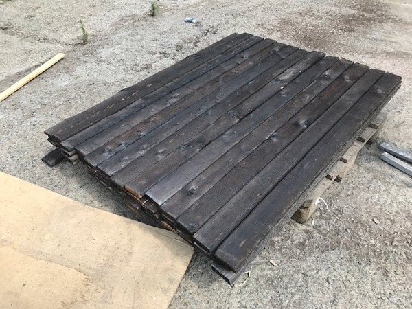 В общем остановились мы на мангале. Купил я пару тон угля, кускового, каменного. Почему не дрова? Жар не контролируется и иногда не успеваешь уследить и просто пережигаешь доску. Почему не древесный уголь(жарики и т.п пакетированый продукт для шашлычка), потому что дорого выходит. А здесь за пару тон угля 6000 р. с доставкой. В общем ЖЖЕМ. Работа суровая, жаркая. угли так раскаляют метал, что просечной лист, 4мм толщиной у нас просто стек на пол в первый раз. Но вот итог первого этапа работы. Доскам достаточно минуты полторы на каждую сторону, чтоб вся смола выкипела. Дерево должно все потрескаться, на сучках вся смола испариться и перестать кипеть. Тогда доска будет идеальной а рисунок контрастным.