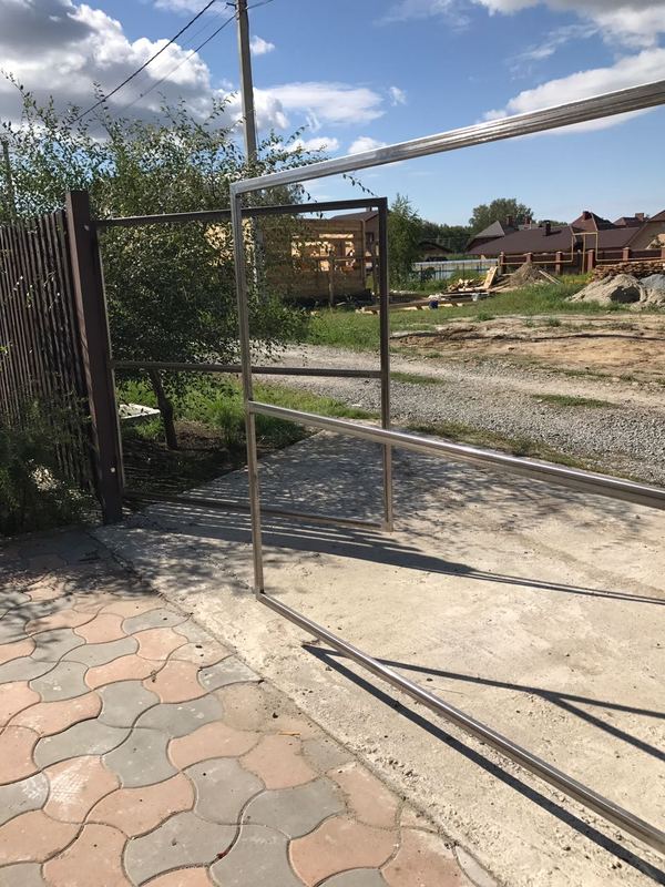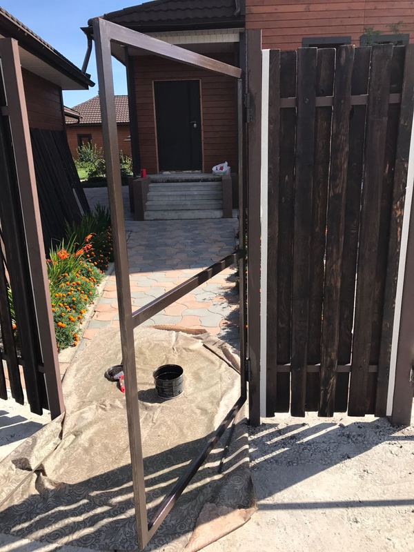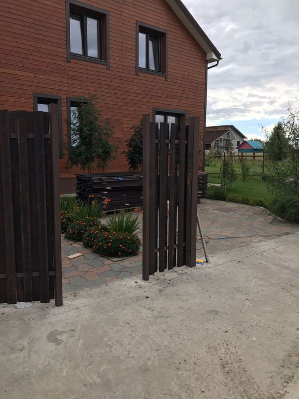 на второй день мы установили калитки и забор. Мама покрасила и на третий день их "зашили"