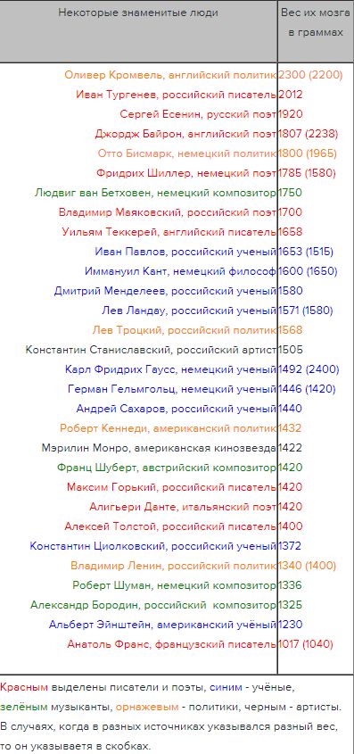 Известно, что у Ивана Сергеевича Тургенева вес мозга оказался равным двум килограммам двенадцати граммам. Можно было бы считать его мозг самым большим, однако, самый тяжёлый мозг — 2850 г — был обнаружен у индивида, который страдал эпилепсией и идиотией. Мозг его в функциональном отношении был неполноценным. Поэтому прямой зависимости между массой мозга и умственными способностями отдельного индивида нет.