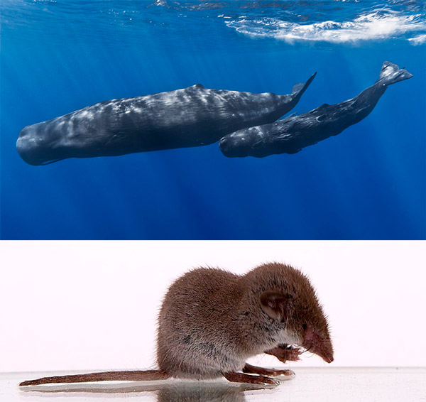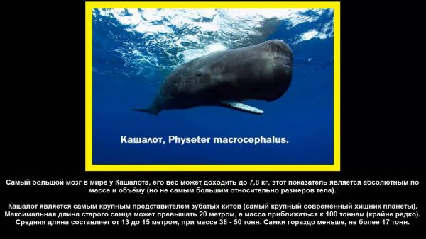Рекордсменом среди всех живых существ планеты по весу мозга является кит Physeter Macrocephalus. Мозг этого животного может достигать девяти килограмм. Однако если вычислить отношение мозга к телу, то получится 1\40 000. Вес мозга кита зависит от его возраста и вида. Известно, что синий кит гораздо крупнее кашалота, однако его мозг меньше и весит лишь шесть килограмм восемьсот грамм. Еще один обладатель большого мозга – северный дельфин белуха. Его мозг весит два килограмма триста пятьдесят грамм, в то время как у дельфина афалина он весит лишь один килограмм семьсот тридцать пять грамм.