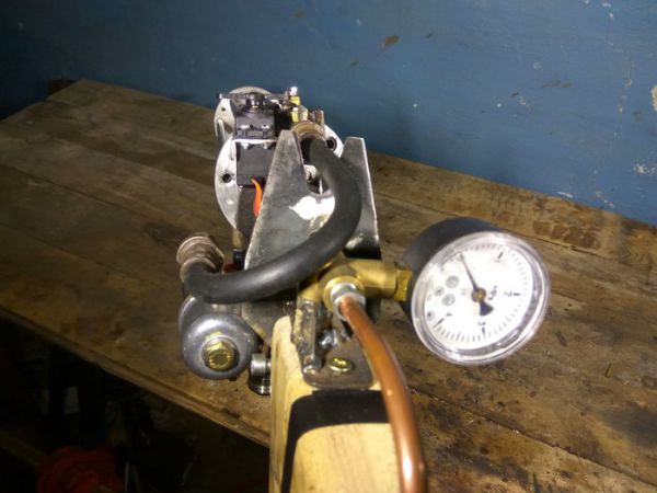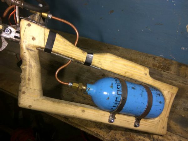 Емкостью для воздуха служит кислородный баллон объемом один литр. К прикладу он крепится металлическими хомутами, для этого в приклад вклеена гайки М6. Воздушный клапан использован от автомобильного ГБО. Все соединения - тормозные медные трубки диаметром 6мм .Тройники латунные, также от тормозных систем. Подвижное соединение - б/у тормозная трубка от моего лансера. Для контроля давления воздуха в системе установлен манометр но 40 атмосфер. Сделан насос для ручной подкачки, как у оригинала.