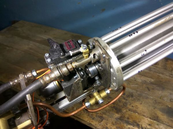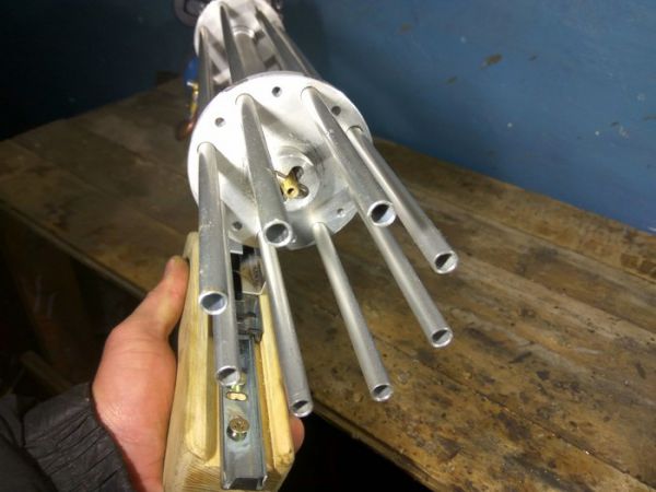 Барабан целиком сделан из дюраля. Выточены и просверлены две детали, для крепления трубок-стволов. Для точности они обрабатывались пакетом. Стволы - дюралевые трубки диаметром 8 мм и толщиной стенки - 1 мм. Стволы вставлены в просверленные отверстия и закреплены стопорами.