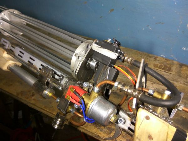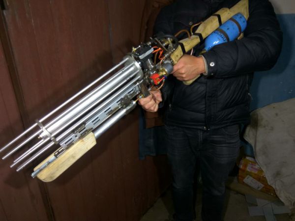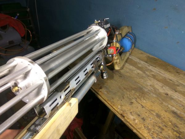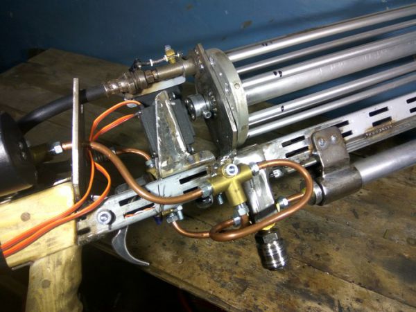 Полосы, длинной сантиметров по 50, сварены между собой с зазором 5 мм. Это нужно для размещения спускового курка и проводов. На раму приварены две плоские детали, которые выполняют роль ствольной коробки, к одной из них приварена направляющая трубка на которой вращается барабан.