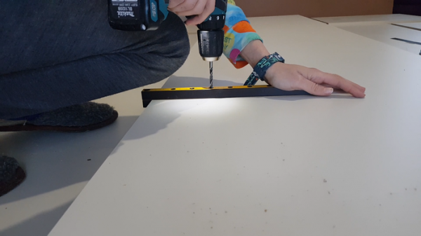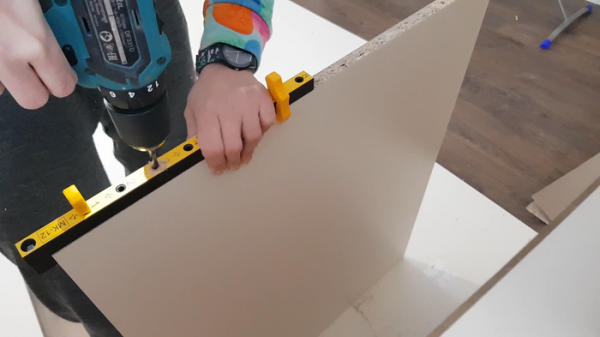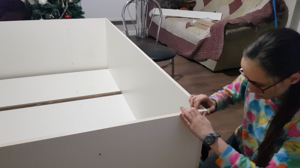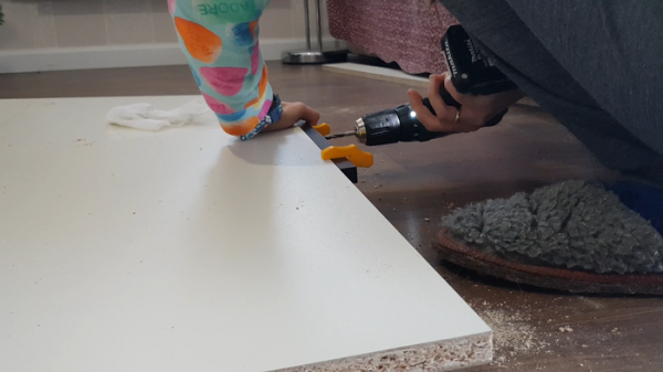 Когда большинство отверстий было готово, я их прозенковала и начала сборку с периметра, использовав мебельную стяжку, так называемые конфирматы. Оказалось, что у меня была не та бита, и поэтому она постоянно застревала, ну да ладно. И так постепенно, в хаотичном порядке я собирала шкаф, параллельно подметая это все. Потом уже добавила еще крепежа, для надежности.
