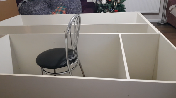 К сожалению, в прихожей было очень плохое освещение. Кое-как приспособила стулья, чтобы держать двп, которая является задней стенкой шкафа и придает ему жесткость. Снизу я использовала молоток, как клин, чтобы не держать на весу, и от нижнего угла начала прихватывать на саморезы эту огромную плиту, все получилось, потом я просто везде ее прибила на мини гвоздики. Кстати, подготовьте маленький молоток для этого, или степлер. Прибивала я их, кстати, часа 4.