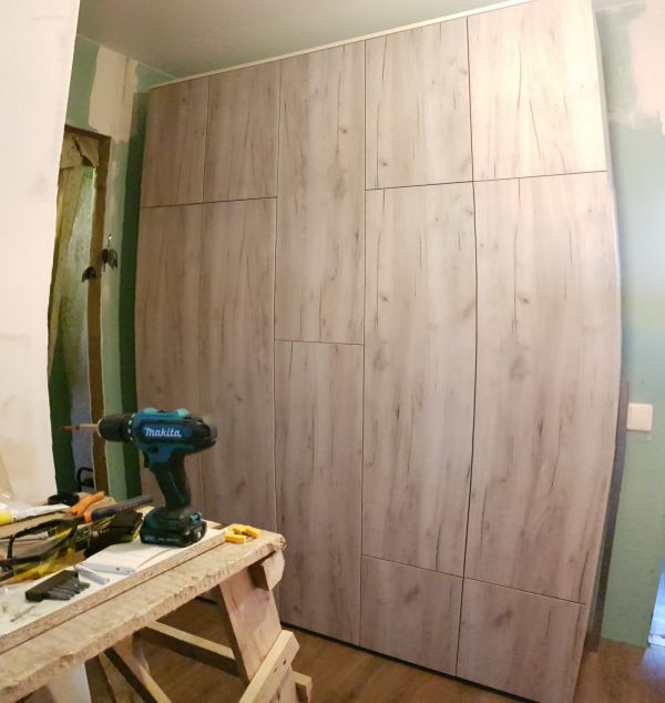 Когда все было готово, и шкаф уже напоминал шкаф, я принялась навешивать дверцы, это самый простой этап. Самый сложный это регулировать петли. Которых, мне кстати не хватило, потому что я вдруг решила, что хочу по 3 петли на большие створки. А вот прикрутить мои открывашки проще было бы, пока шкаф лежал на полу, ну да ладно, это тоже довольно быстро, на самом деле, я до сих пор не просверлила ответные штучки, которые примагничиваются к ним, потмоу что это надо было делать до того, как дверцы висят, займусь этим когда-нибудь...позже. Как видите, ничего сложного, лего большого размера главное не ошибиться в расчетах. Я уверена, что сделать современный и стильный шкаф своими руками и недорого сможет каждый, было бы желание.
