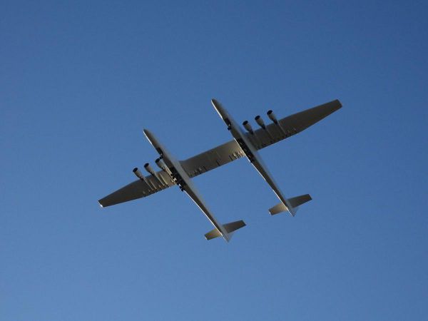 Stratolaunch - двухфюзеляжный самолет с размахом крыльев, составляющим около 117 метров (больше футбольного поля). Длина самолета достигает 53 метров, а высота - 15 метров. Гигант оснащен шестью двухконтурными турбореактивными двигателями Pratt&Whitney, а также 28 колесами. Центральная часть самолета между фюзеляжами предназначена для крепления космических ракет. Масса самолета достигает 227 тонн, а максимальная взлетная масса - около 590 тонн.