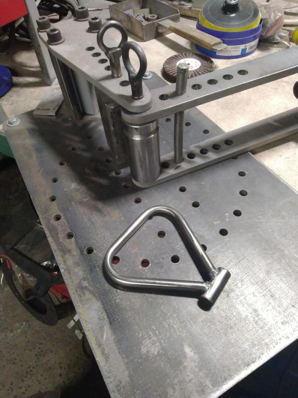 Теперь "дрочевные пи***лины", которые делают проект проектом. В данном случае, это ручка для перемещения табуретки по гаражу. Делается из нержавеющей трубки Ф10 стенка 1. Грётся на флэт-бендере (разумеется, самодельном), а потом к ней подваривается трубка, вырезанная в самом начале. Кстати, я хз, чо за металл они юзали в своей Удмуртии на своём Иже, но это капец, ребза. Варится он примерно так: берёшь 50 ампер постоянки (аргонно-дуговая сварка), подносишь электрод к металлу, металл делает "бздыщь" и электрод надо точить. В итоге, эту штуку я варил чуть не полчаса. Адок ваще.
